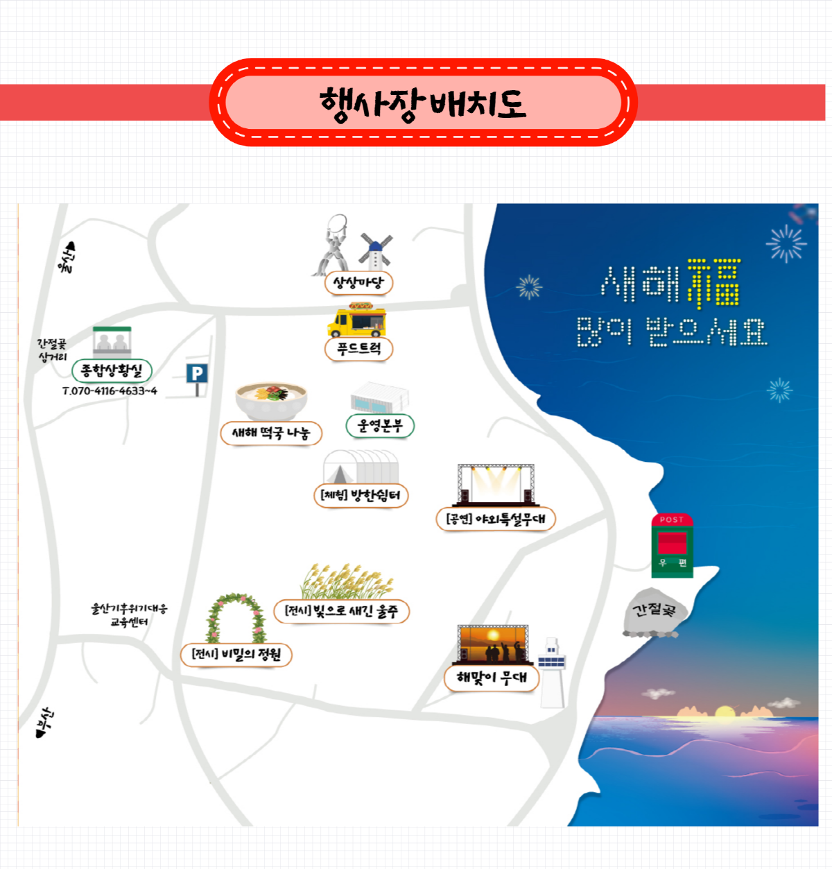 간절곶 해맞이 축제는 매우 인기가 많아 많은 사람들이 모입니다. 주차 공간과 자리를 확보하기 위해 일찍 도착하는 것이 좋습니다. - 따뜻한 옷 준비하기