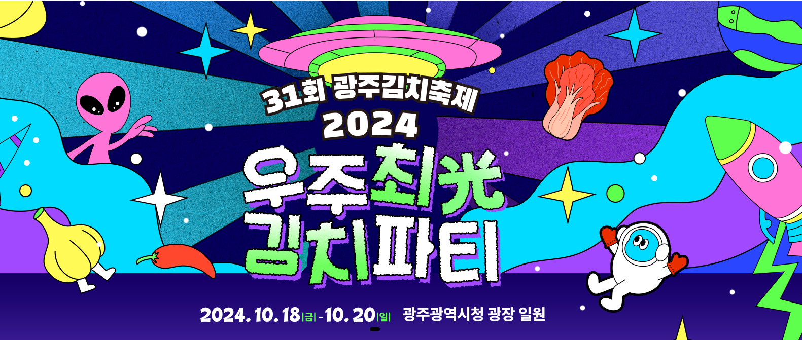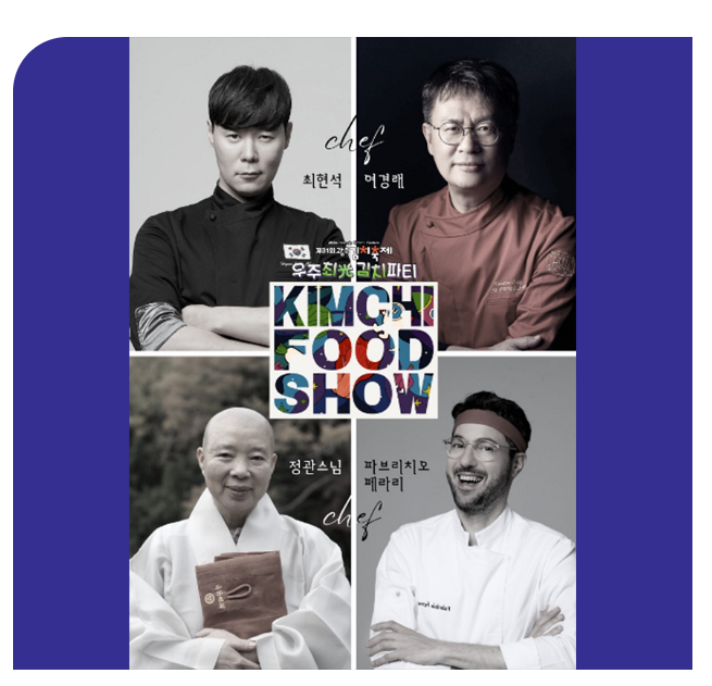 일시2024. 10. 18.(금) ~ 10. 19.(토) / 금요일 2회, 토요일 1회장소광주광역시청 주무대참가셰프페라리 파브리치오, 정관스님, 최현석, 여경래, 신카이 미야코내용- 광주김치에 대한 국내외 스타셰프 5인의 다양한 해석을 생생하게 경험할 수 있는 쿠킹 라이브쇼- 대통령상을 수상한 김치명인의 김치와 다국적 요리 스타일이 결합된 색다른 김치요리 레시피 공개- 푸드쇼 관람 후 음식 시식행사