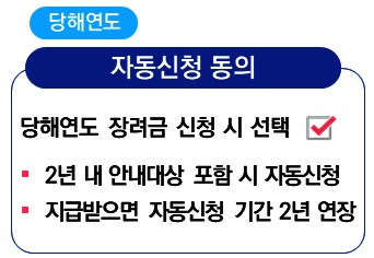 65세 이상 고령자 또는 중증장애인이 매년 장려금을 신청하는 불편을 해소하고 신청누락을 방지하기 위하여 지난해 「자동신청 제도」를 도입하였으며, 올해 대상 연령을 60세 이상으로 확대하였습니다.