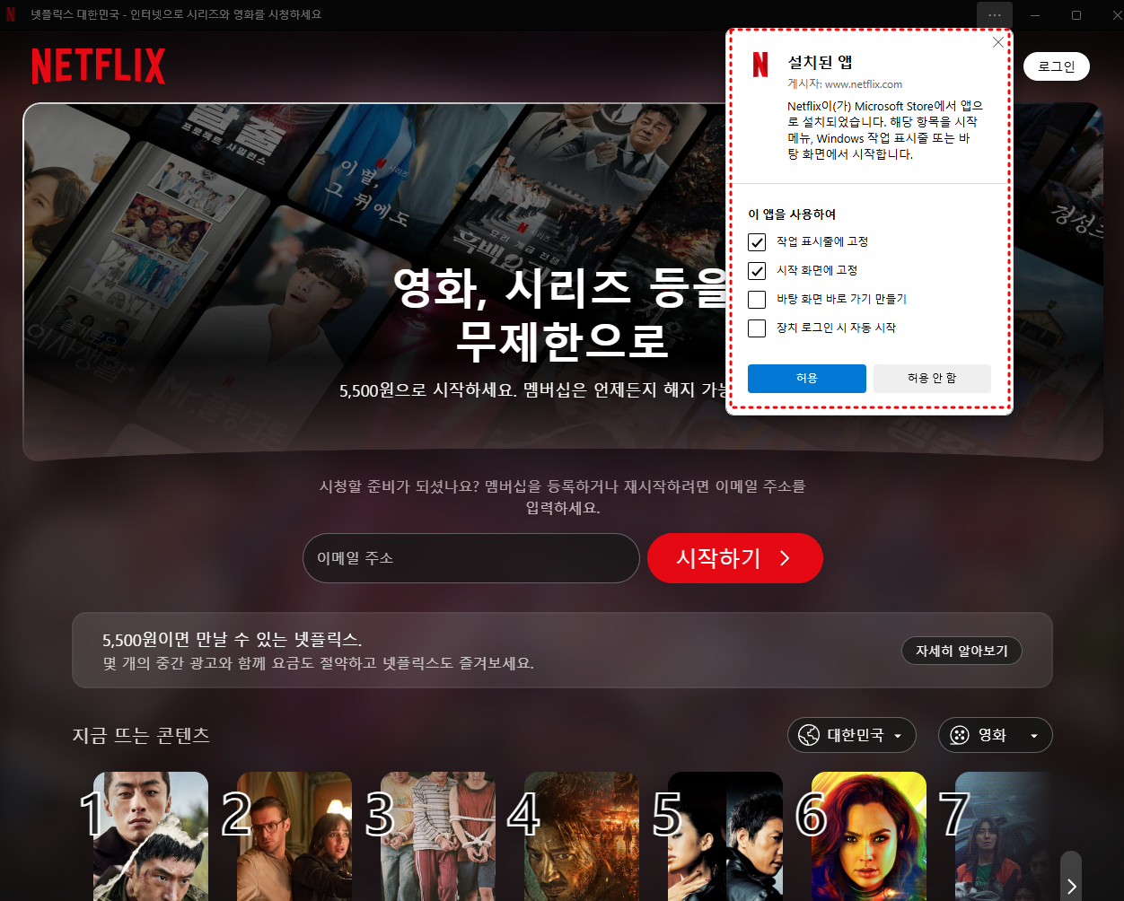 - 설치가 완료되면 시작 버튼을 클릭하여 넷플릭스 앱을 실행합니다.