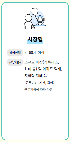 시장형 일자리는 만 60세 이상 노인들에게 제공되는 일자리로, 수익 창출이 가능한 사업에 참여하는 유형이에요.