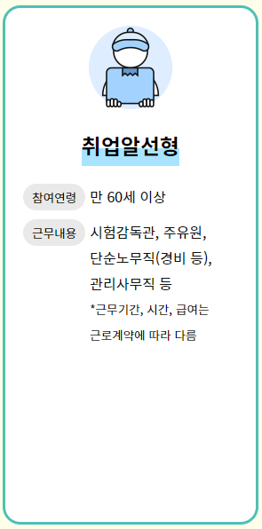 취업알선형은 만 60세 이상의 노인들을 대상으로 취업을 돕는 유형이에요. 이 유형에서는 시험감독관, 주유원, 단순 노무직(예: 경비, 관리사무직) 등 다양한 분야에서 일할 수 있는 기회를 제공합니다.