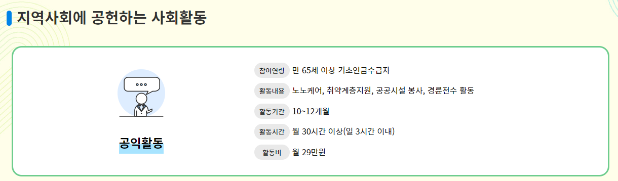 공익활동형은 만 65세 이상의 기초연금 수급자를 대상으로 하는 노인일자리 유형이에요.