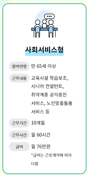 또한, 취약계층의 공익증진을 위한 서비스나 노인 맞춤형 돌봄 서비스도 포함되죠. 사회서비스형의 근무기간은 10개월로, 한 달에 60시간 근무할 수 있어요.