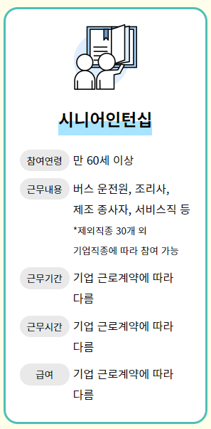시니어인턴십은 만 60세 이상의 노인들이 정식 근로자로 취업할 수 있도록 돕는 인턴십 프로그램이에요. 버스 운전원, 조리사, 제조업 종사자, 서비스직 등 다양한 분야에서 일할 수 있어요.