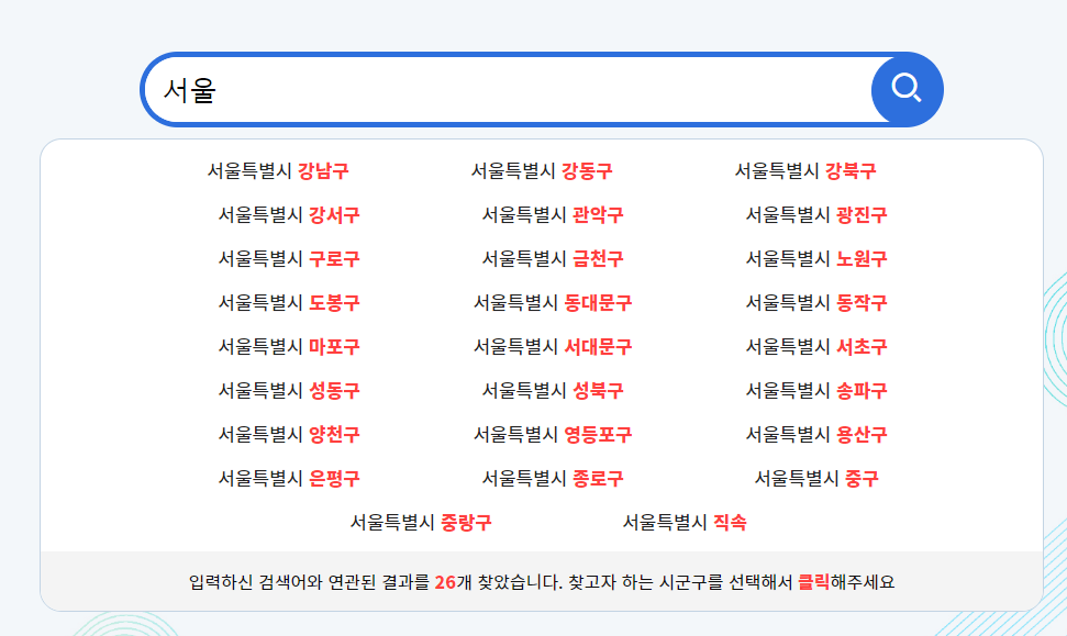 사이트에 접속한 후, 원하는 지역을 검색창에 입력해요.