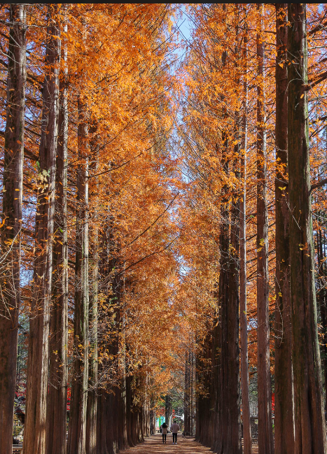 남이섬에서 가장 유명한 명소인 메타세쿼이아 길은 높게 뻗은 나무들이 일렬로 서 있는 경관으로, 자연의 터널 속을 걷는 듯한 착각을 불러일으킵니다. 가을이 되면 이 길을 따라 나무들이 붉은 빛으로 물들며 영화 속 한 장면 같은 로맨틱한 풍경을 만들어냅니다. 특히 해질 무렵 붉게 타오르는 하늘 아래로 비치는 단풍은 더욱 아름다워, 많은 방문객들이 이 순간을 포착하기 위해 몰려듭니다.