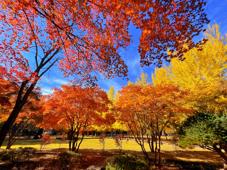 이곳의 단풍은 다양한 색깔로 물들어, 노란색, 주황색, 빨간색의 조화가 이루어져 있습니다.