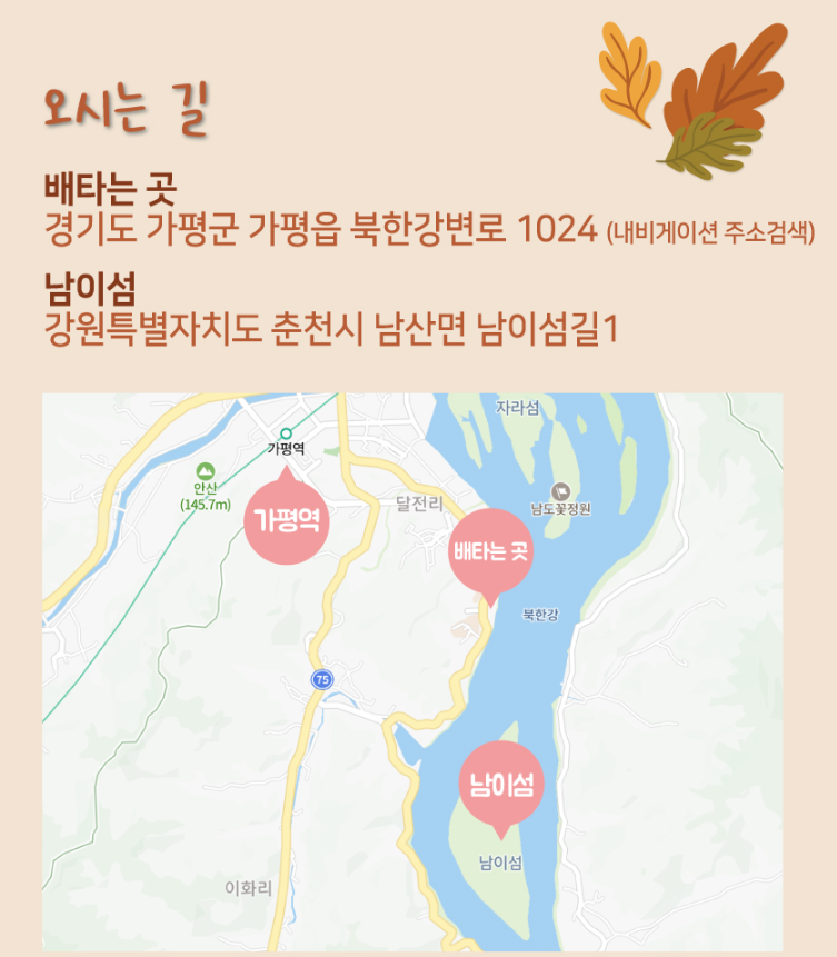 남이섬을 방문하는 첫 관문인 유람선 선착장도 가을이 되면 단풍으로 가득 차 장관을 이룹니다. 남이섬으로 향하는 유람선을 타고 섬에 다가가는 동안, 물가에 드리운 단풍이 아름답게 반사되어 특별한 경치를 감상할 수 있습니다. 이 경치는 남이섬에서만 느낄 수 있는 독특한 매력 중 하나로, 여행의 시작부터 남이섬의 가을을 온전히 느끼게 해줍니다.
