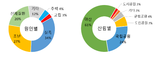 - 사고 원인은 미끄러지거나 넘어지며 발생하는 실족 사고 34%, 길을 잃는 조난 27%, 지병 등으로 인한 신체질환 20%, 추락 4%, 고립 3% 순으로 나타났다.