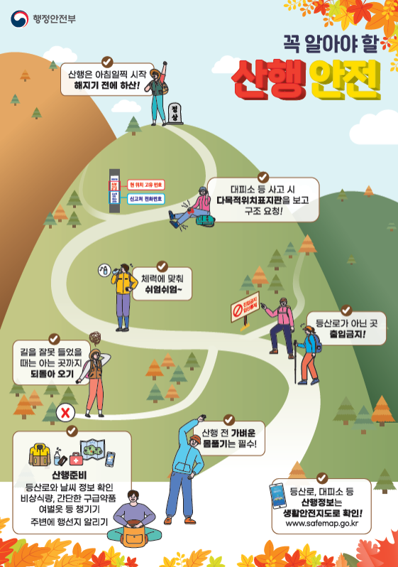 단풍이 전국으로 확대되면서 단풍을 즐기려는 등산객이 많아짐에 따라, 산행 시 안전사고 발생에 각별한 주의가 필요한 시기입니다.