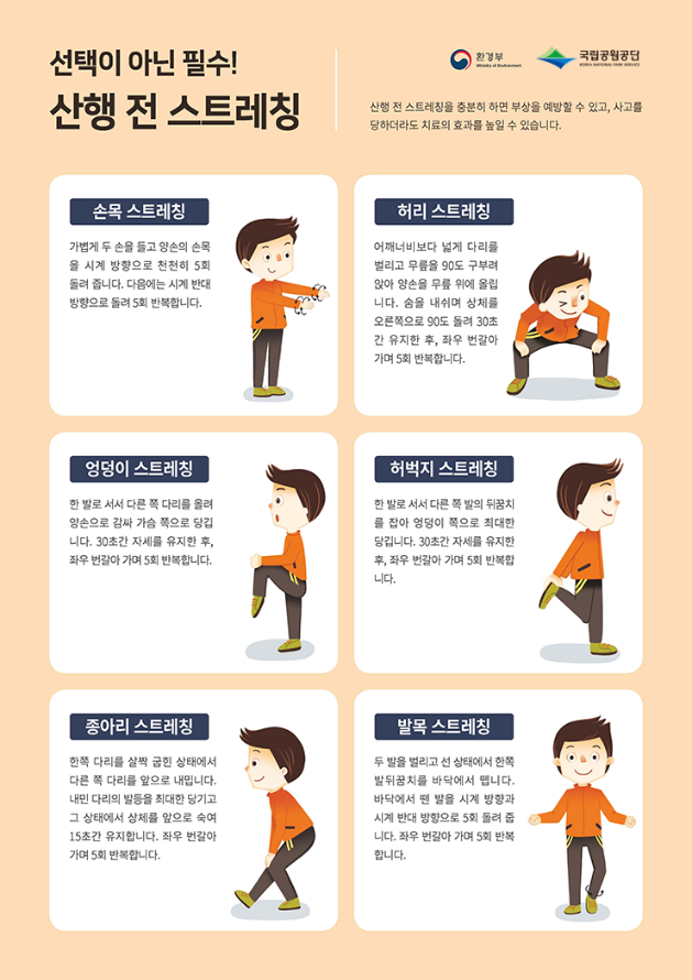 ○ 산행은 가벼운 몸풀기로 시작해 자기 체력에 맞는 등산로를 선택하고, 산행 중이라도 몸에 무리가 오면 즉시 하산해야 한다.