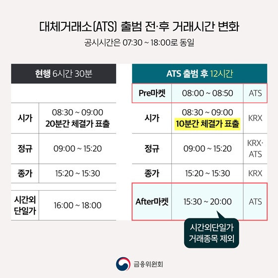 한국거래소 독점 체제에서는 하루 거래 가능 시간이 평일 오전 9시부터 오후 3시30분까지였지만, 앞으로 12시간으로 늘어난다고 보시면 됩니다.