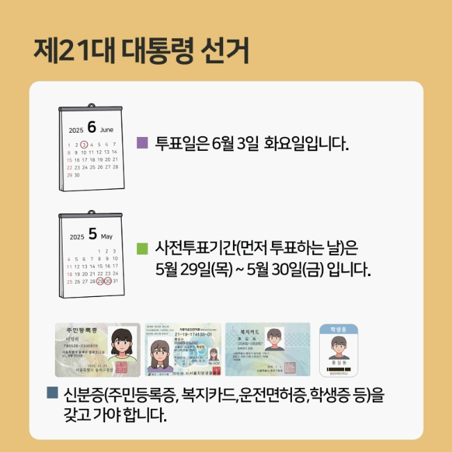 2025년 5월 29일과 30일, 가까운 사전투표소를 찾아 신분증 하나만 챙기시어 대한민국의 미래를 함께 끌고 갑시다.