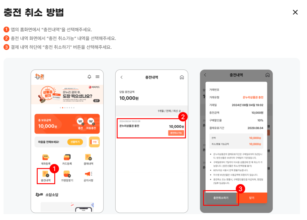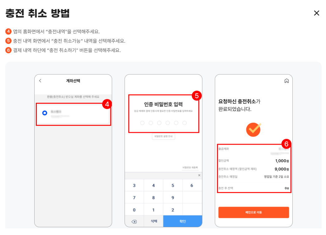 구매 후 7일 이내 미사용 충전 금액 한해 '앱의 홈 화면 > 충전 내역 > 충전 내역 상세'에서 취소 가능하며, 기한 지난 경우 충전 취소가 불가합니다.