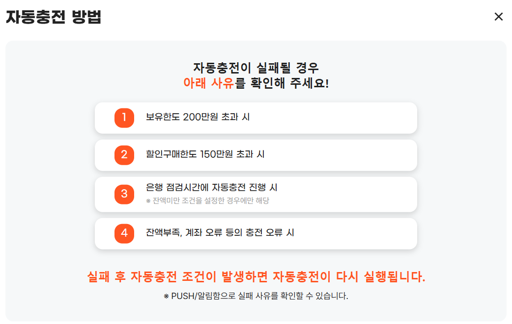 - 충전하고자 하는 금액 충전 시 10% 할인가로 충전되며 최대 보유한도금액 200만원까지 가능