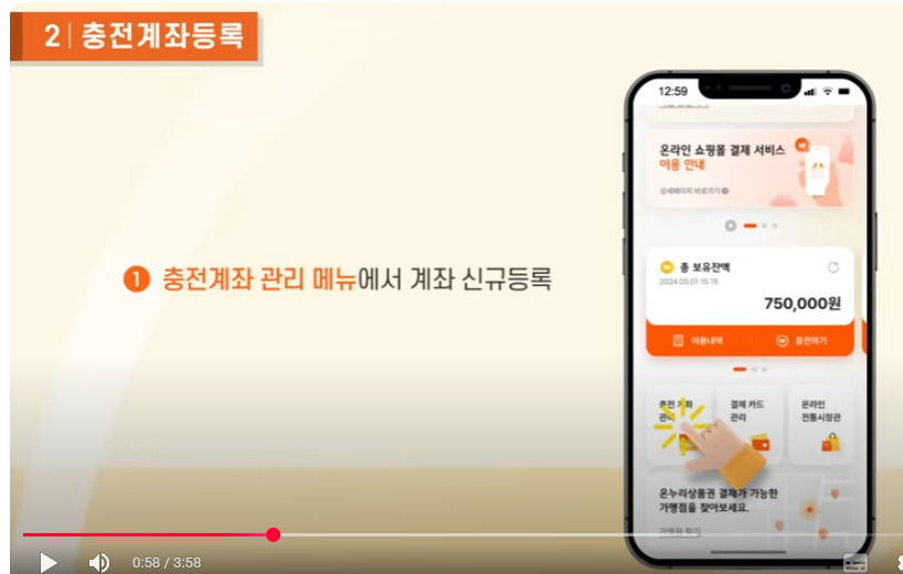 - 온누리상품권 메인 홈 화면에서 '충전' 선택 후, 앱에 등록된 본인계좌 중 충전 계좌 선택