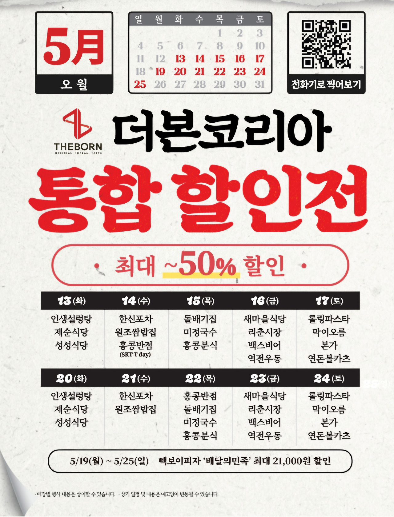 5월 13일부터 5월 25일까지, 백종원의 더본코리아에서 운영하는 인기 프랜차이즈 음식점이 대규모 할인 이벤트를 진행해요.
