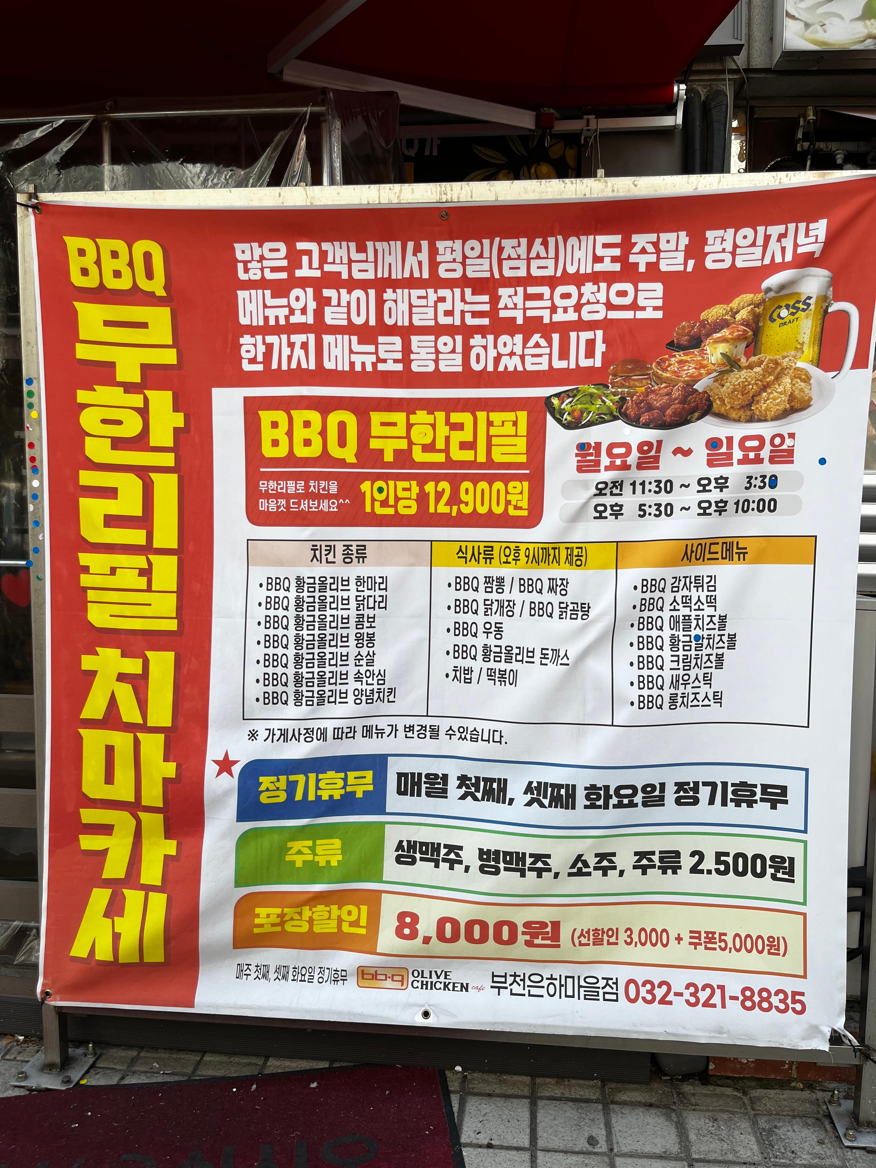 요즘 물가 장난 아니죠 ~치킨을 좋아하시는 분이시면 물가 체감이 더욱 심할 거라 생각합니다. 오늘 소개해드릴 부천 BBQ치킨뷔페를 다녀왔습니다. 1인당 12900원의 가성비, BBQ 무한리필 치킨을 마음껏 무제한리필 ,이용요금 주차 이용방법을 알려드리겠습니다.