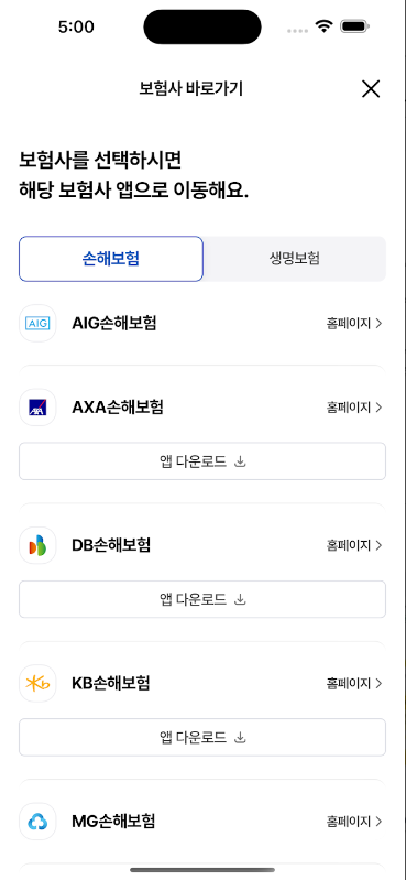 통해서 한국신용정보원 조회를 통해 본인이 가입한 보험계약이 자동으로 뜨고