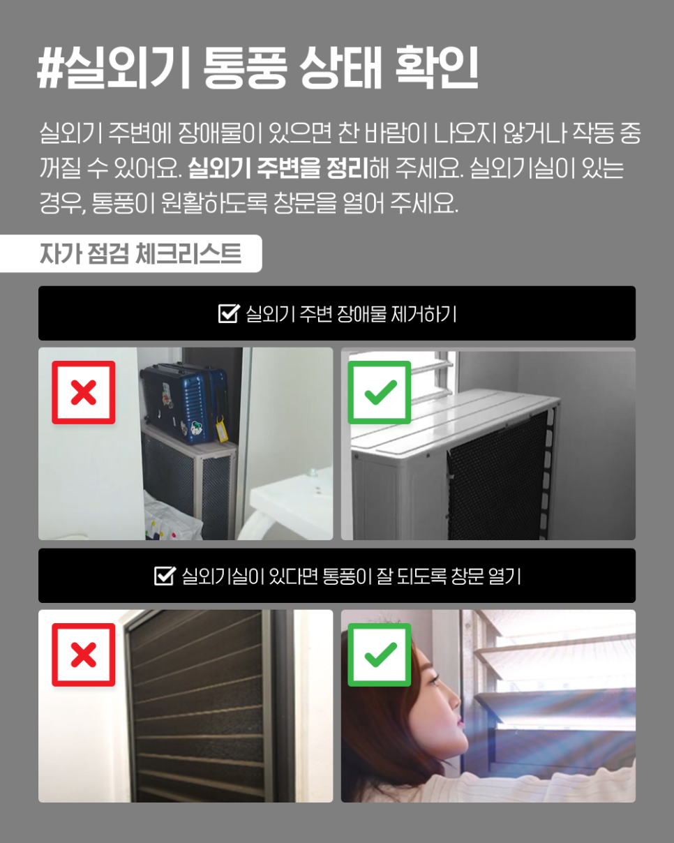 ✔️ 통풍이 원활하도록 실외기 주변을 정리해 주세요.