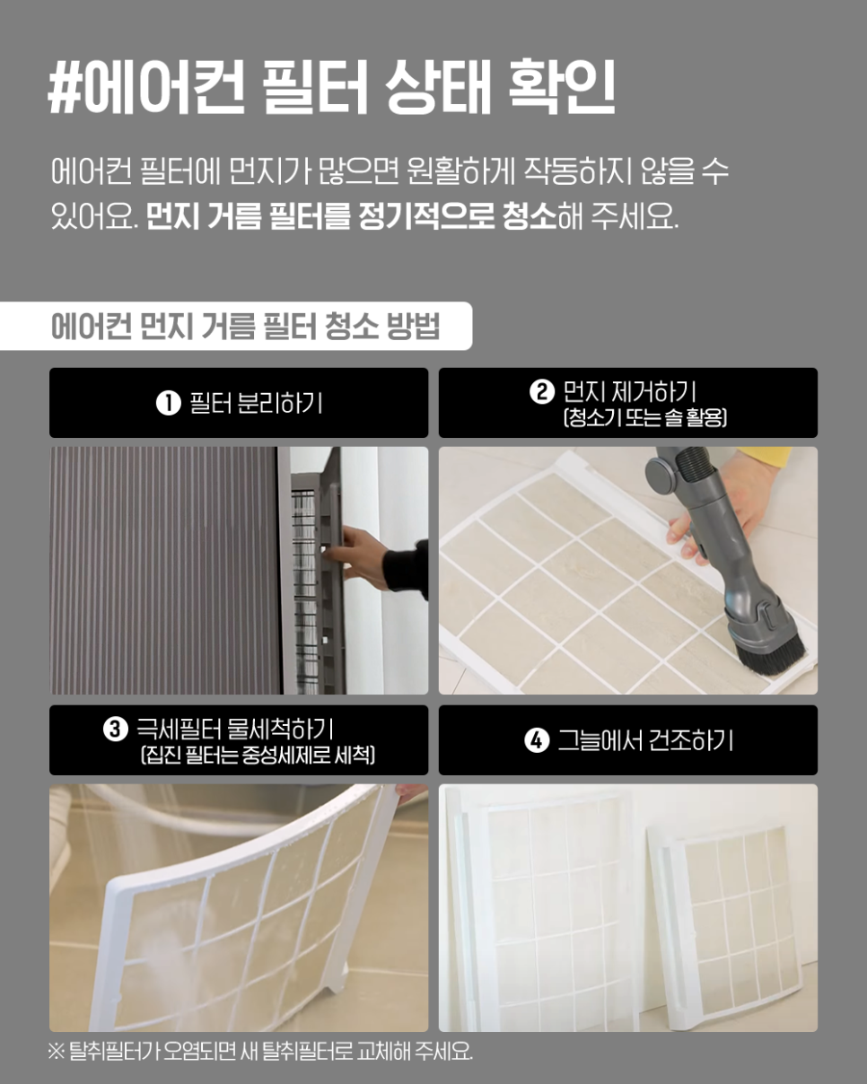 ✔️ 먼지 거름 필터 상태를 확인하고 청소해 주세요.