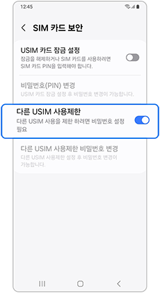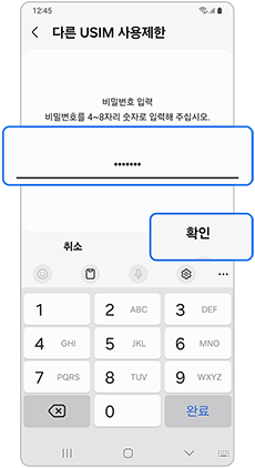 USIM 설정에서 다른 USIM 사용제한이 설정된 경우 설정한 비밀번호를 입력하시면 해제할 수 있습니다.