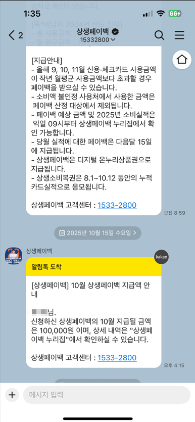 2025년 10월 15일 상생페이백에서 카톡 문자가 왔어요.