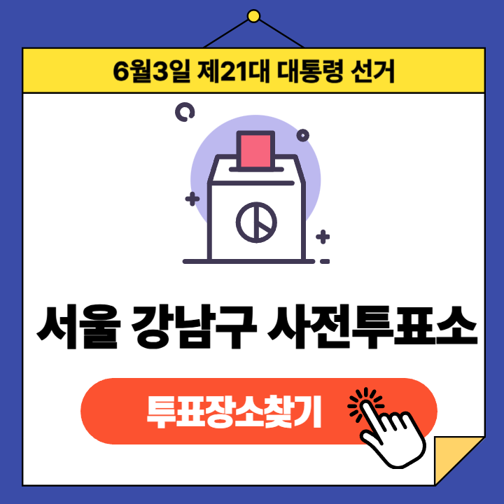 제21대 대통령선거(2025년 6월 3일) 서울특별시 강남구 유권자분들을 위한 사전투표소 정보 안내글입니다.