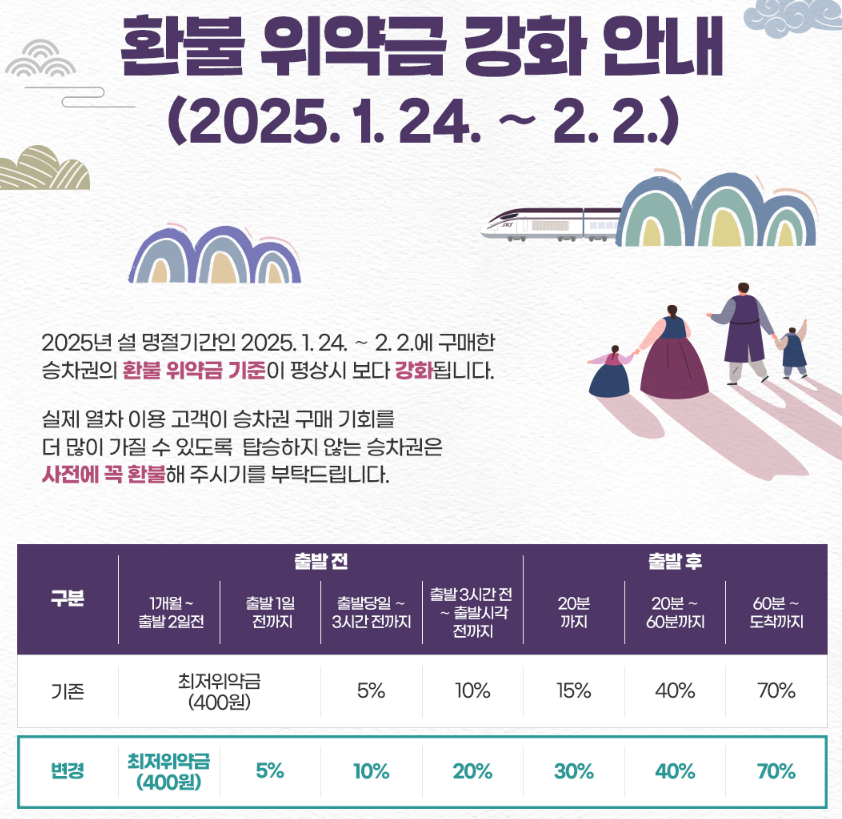 2. 위약금 안내: 위약금은 환불 시점에 따라 다르게 적용됩니다. 2025년 설 명절부터 위약금 기준이 강화되었으니, 아래 내용을 꼭 확인하세요.