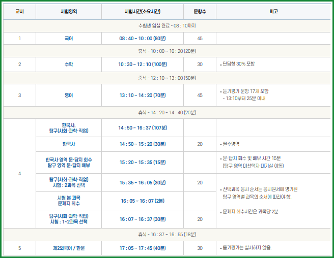 - 1교시 국어: 8:40 - 10:00 (80분) 45문항수
