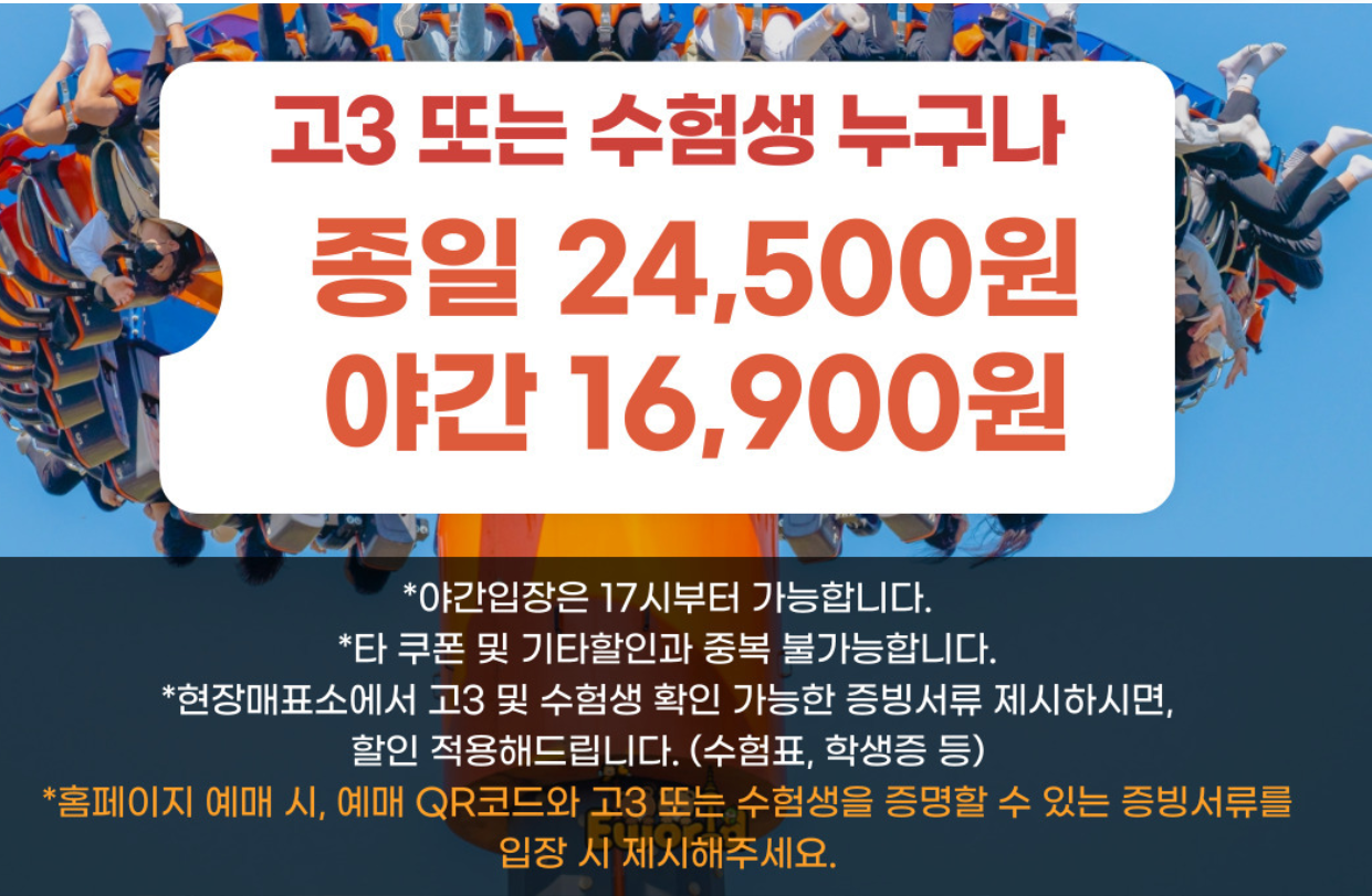 수험생이라면 놓칠 수 없는 혜택, 바로 놀이공원 할인입니다! 수험표를 챙겨서 평소 가보고 싶었던 놀이공원에 방문해 보세요.