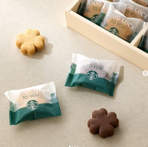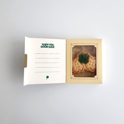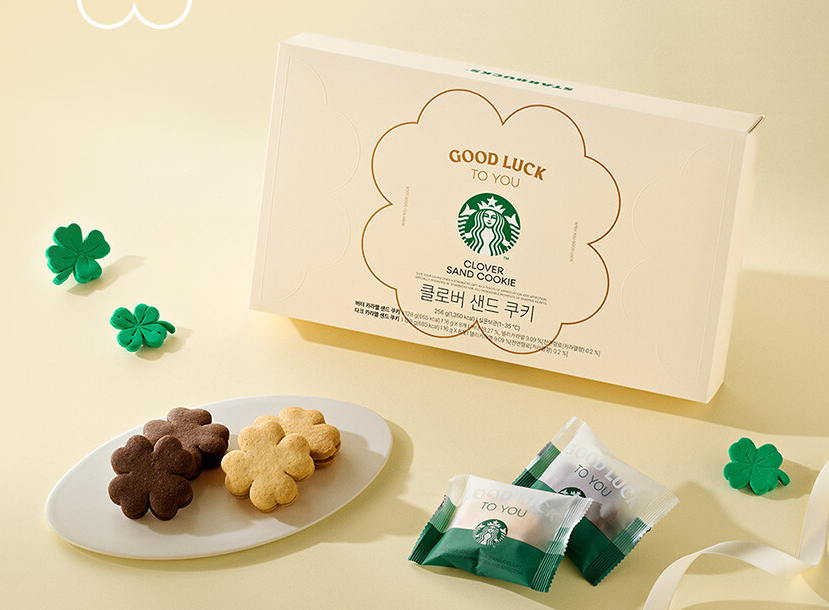 행복을 담은 네 잎 클로버 모양의 샌드 쿠키로 버터 캐러멜 맛과 다크 캐러멜 맛이 있습니다.
