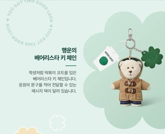떡볶이 코트를 입고 있는 베어리 스타 키 체인은 행운을 주는 네 잎 클로버 장식이 달려 있으며, 행택(메모장)을 통해 응원의 문구를 전달할 수 있습니다.