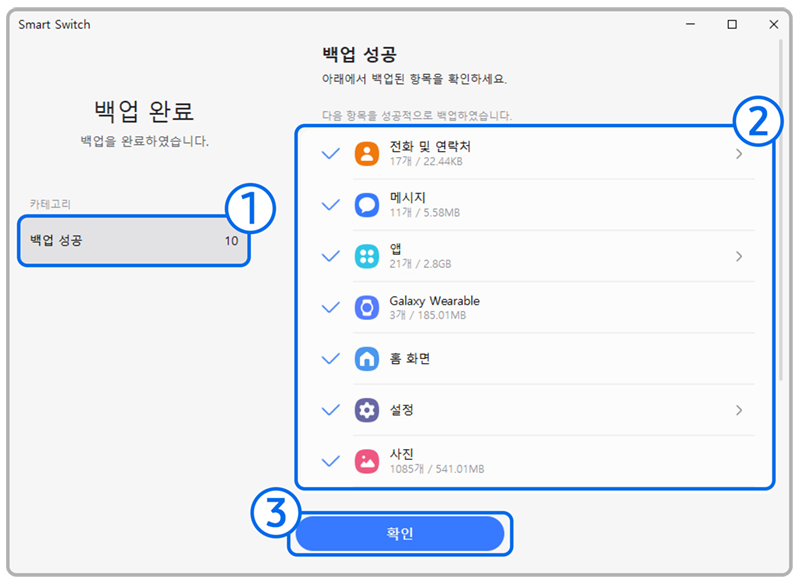 3단계) 백업이 완료되면 백업 완료 항목을 확인하세요.