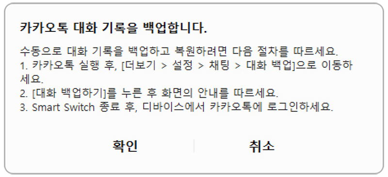 ※ 스마트 스위치 PC를 이용한 PC 백업/복원, SD 카드 백업/복원, 삼성 클라우드를 통한 백업/복원 시에는 카카오톡 대화 내용 백업/복원은 지원되지 않습니다. (카카오톡 개인정보 보호정책 기준)
