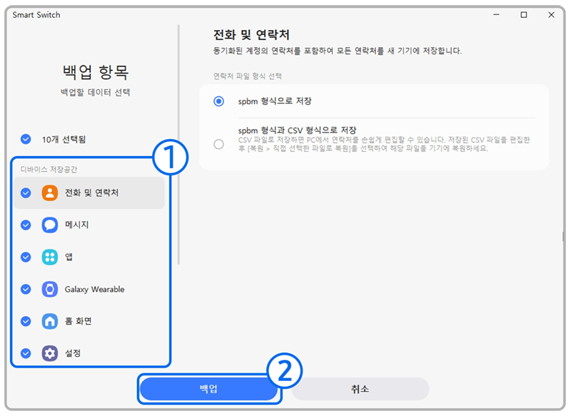 연락처 파일 형식은 '.spbm 형식으로 저장'과, '.spbm 형식과 CSV 형식으로 저장' 중 선택하여 백업할 수 있습니다.
