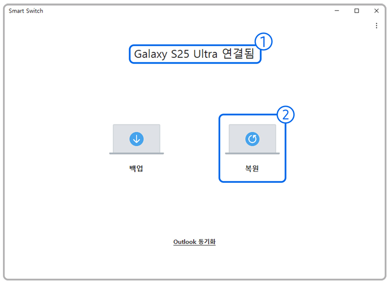 1단계) PC에서 스마트 스위치 실행 후 휴대전화를 연결하고 복원을 선택합니다.