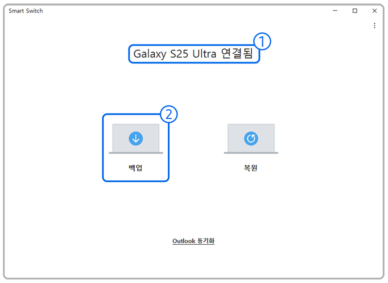 1단계) PC에서 스마트 스위치 실행 후 휴대전화를 PC에 연결하고 백업을 선택합니다.
