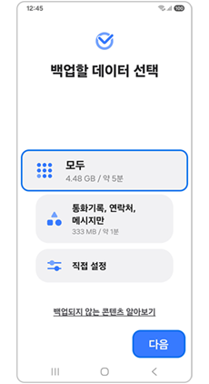 ※ 메시지의 경우 많은 메시지를 백업할 경우 백업시간이 길어지거나, 휴대전화 속도가 느려질 수 있습니다. (백업할 메시지의 기간을 “모두/최근2년/최근12개월/최근6개월/최근3개월/ 최근30일” 중에서 선택 가능)