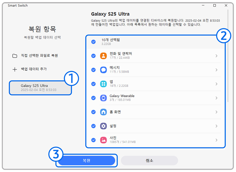 2단계) 복원 항목(PC에 백업된 휴대전화 데이터 중 복원할 항목) 선택 후 복원을 실행합니다.