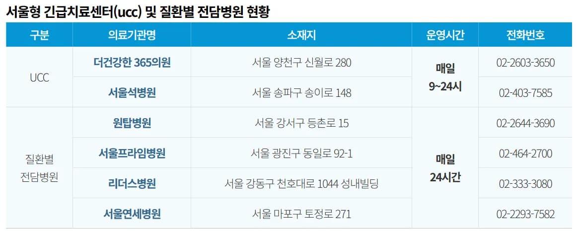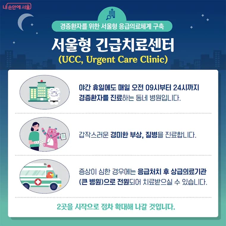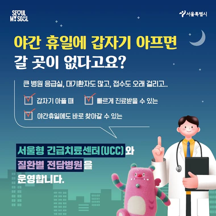 ‘서울형 긴급치료센터(UCC, Urgent Care Clinic)’와 ‘서울형 질환별 전담병원’의 운영을 시작합니다.