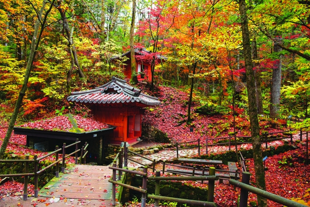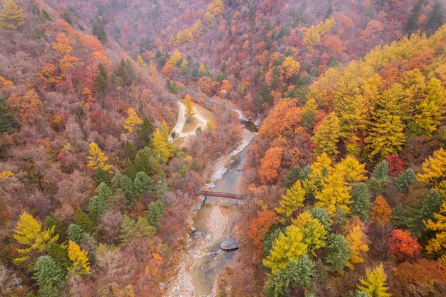 가을철 오대산 선재길은 특히 아름답습니다. 단풍이 물든 나무들이 길을 따라 늘어서 있어, 걷는 내내 환상적인 풍경을 감상할 수 있습니다.