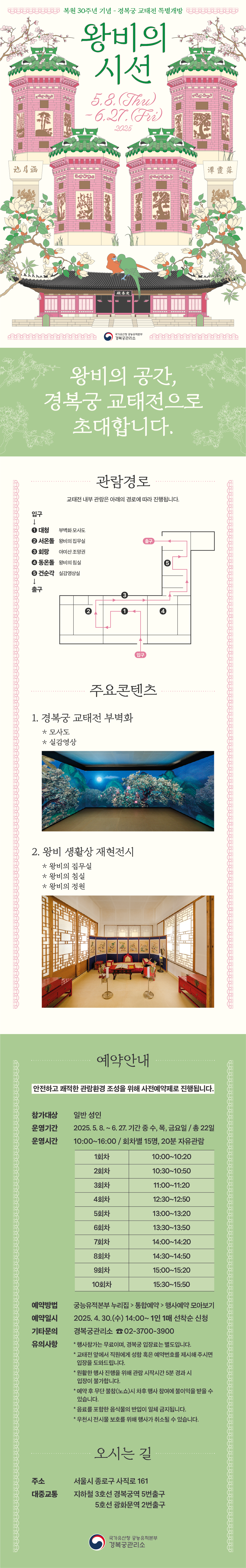 이번 봄, 경복궁 교태전에서 조선 왕비의 숨결을 느끼며, 잊지 못할 시간을 보내보시기 바랍니다.