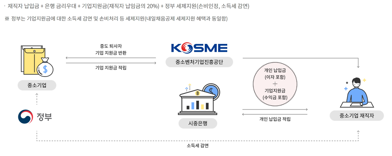 - 정부 : 만기시 기업지원금에 대한 소득세 50%(청년근로자 90%) 감면 혜택