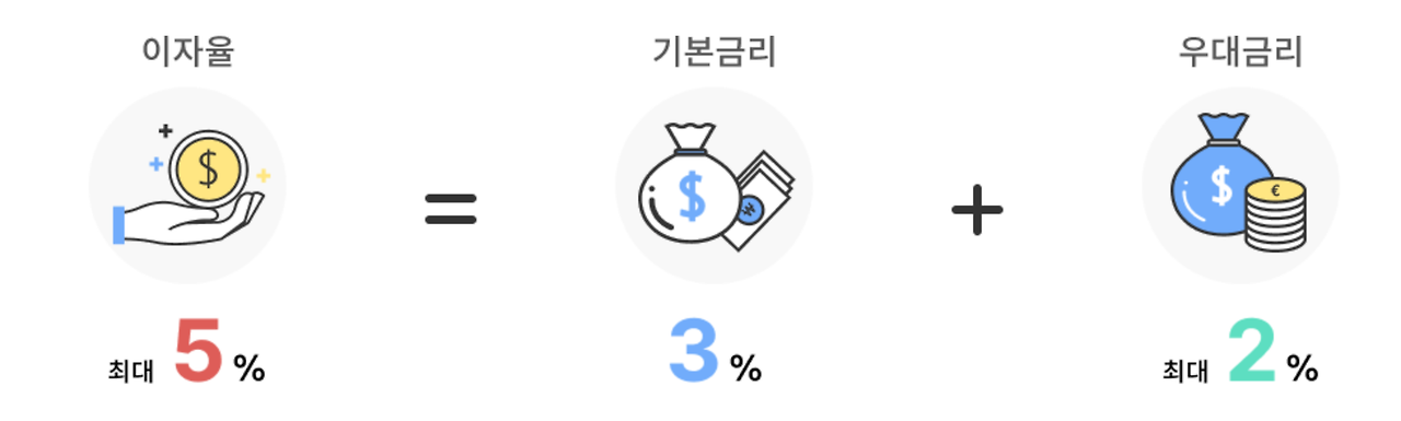 기본 금리는 3%이며 우대 금리를 최대 2%까지 추가로 받을 수 있어 연 최고 5%의 금리가 적용됩니다.