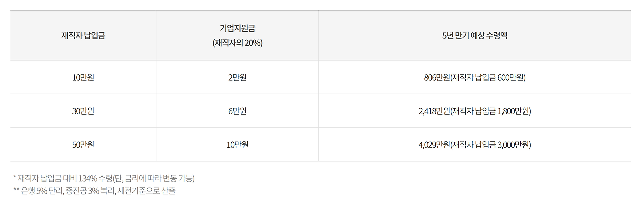 | 재직자 납입금 | 기업 지원금 ( 재직자의 20 %) |