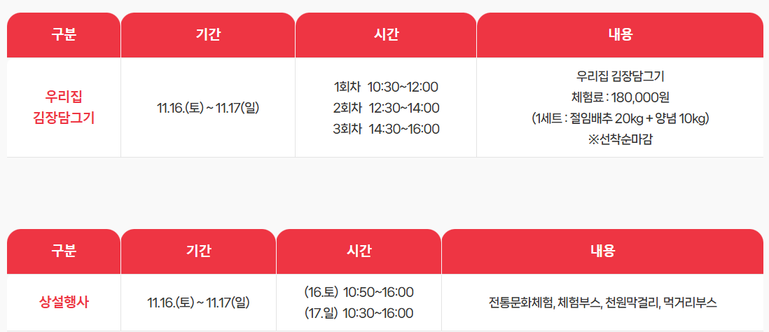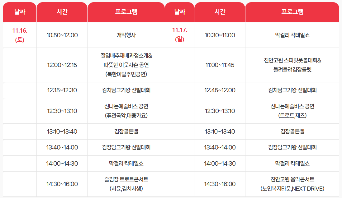 | 프로그램 | 우리집 김치담그기 : 3타임 운영(10:30, 12:30, 14:30)./ 60가정씩 운영예정 사랑의 1포기 : 청소년봉사동아리 김장담그기 체험 후 불우이웃 김장나눔 행사 진행 김장문화체험 : 김치 1포기 버무리기 체험(100~150포기 제한) 쇼미더김장 : 김치1포기 빨리 버무리기 대회 진행 및 시상(11:30/13:00 2회진행) 김치골든벨 : 참여자 대상(30명)과 일반상식, 지역관련골든벨 진행 보부상 : 분위기 유도, 관람객 소통을 통하여 농산물 홍보 전통놀이체험 : 두부만들기, 떡메치기, 달고나체험 등 |