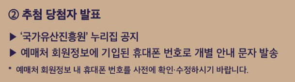 국가유산진흥원 누리집 공지 및 티켓링크 회원정보에 기재된 휴대폰 번호로 개별 안내됩니다.
