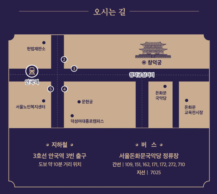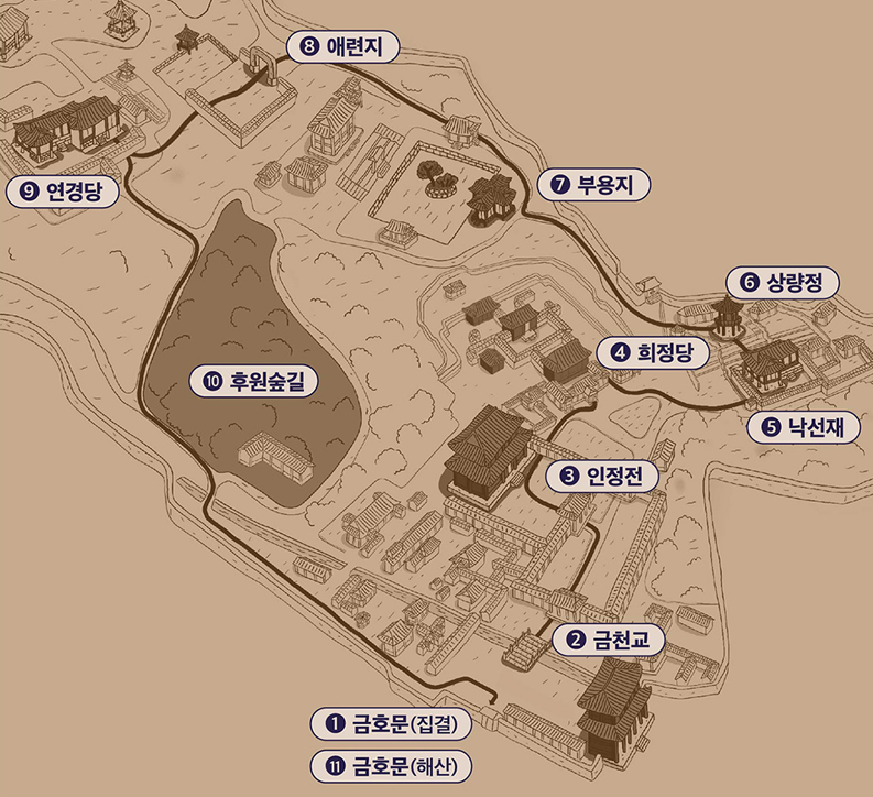 전문 해설사와 함께 청사초롱을 들고 창덕궁의 주요 전각과 후원을 탐방하며, 각 장소에서 전통 예술 공연을 즐길 수 있습니다. 올해는 돈화문 공사로 인해 금호문에서 출발하며, 코스는 다음과 같습니다.